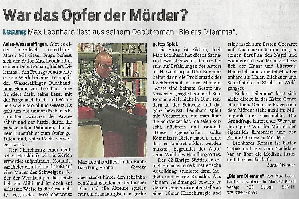 Suche: Neuerscheinungen Alle Bücher anzeigen als E-Book erhältlich Belletristik Bildband Biographie Christliche Literatur Erfahrungsberichte Geschichte Gesundheit Kinder / Jugendgeschichten Lyrik Musik Mundarten Region Dessau Region Göppingen / Hohenstaufen außergewöhnliche Reiseberichte Sachbücher Theater Tier / Natur Weihnachten Sonderangebote Vergriffene Bücher | Zurück zum Buch Presseartikel zu "Bielers Dilemma Roman" von Max Leonhard: In der Ischler Woche 4.4.18 ![]() Dolomiten Zeitung am 15.3.18 ![]() Schwäbische Post 27.11.17 ![]() die salzburgerin - oktober 17 ![]() Augsburger Allgemeine 13.5.17 ![]() SWP Ende April 17 ![]() NWZ 9.3.17 ![]() GEPPO 1.3.17 ![]() |