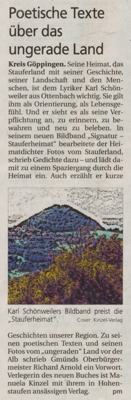 Suche: Neuerscheinungen Alle Bücher anzeigen als E-Book erhältlich Belletristik Bildband Biographie Christliche Literatur Erfahrungsberichte Geschichte Gesundheit Kinder / Jugendgeschichten Lyrik Musik Mundarten Region Dessau Region Göppingen / Hohenstaufen außergewöhnliche Reiseberichte Sachbücher Theater Tier / Natur Weihnachten Sonderangebote Vergriffene Bücher | Zurück zum Buch Presseartikel zu "Signatur Stauferheimat Gedichte" von Karl Schönweiler, Schoenweiler: NWZ 21.8.18 ![]() NWZ 21.8.18 ![]() NWZ 17.3.2018 ![]() NWZ 14.3.2018 ![]() Mitteilungsblatt Ottenbach 22.3.18 Wochenblatt 7.12.2016 Schönweiler ![]() NWZ 4.8.2016 ![]() |