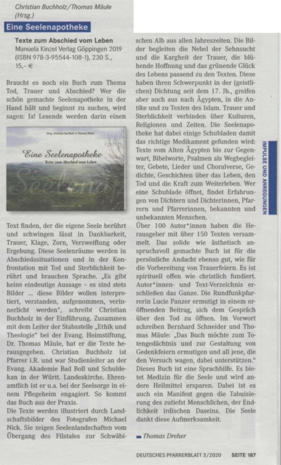 Suche: Neuerscheinungen Alle Bücher anzeigen als E-Book erhältlich Belletristik Bildband Biographie Christliche Literatur Erfahrungsberichte Geschichte Gesundheit Kinder / Jugendgeschichten Lyrik Musik Mundarten Region Dessau Region Göppingen / Hohenstaufen außergewöhnliche Reiseberichte Sachbücher Theater Tier / Natur Weihnachten Sonderangebote Vergriffene Bücher | Zurück zum Buch Presseartikel zu " Eine Seelenapotheke Texte zum Abschied vom Leben" von Hrsg.: Dr. Thomas Mäule & Christian Buchholz: NWZ 16.9.21 NWZ 19.10.20 Zeitschrift Entwruf Sep. 20 Dt. Pfarrerblatt März 20 GEPPO Wo 49 |